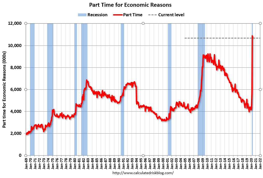 “The number of persons employed part time for economic reasons, at 10.6 million, changed little in May, but is up by 6.3 million since February. These individuals, who would have preferred full-time employment, were working part time because their hours had been reduced or they were unable to find full-time jobs. This group includes persons who usually work full time and persons who usually work part time.“