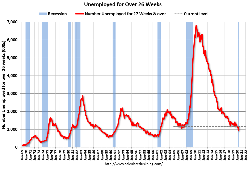 According to the BLS, there are 1.164 million workers who have been unemployed for more than 26 weeks and still want a job. This will increase sharply in 4 or 5 months, and will be a key measure to follow during the eventual recovery.