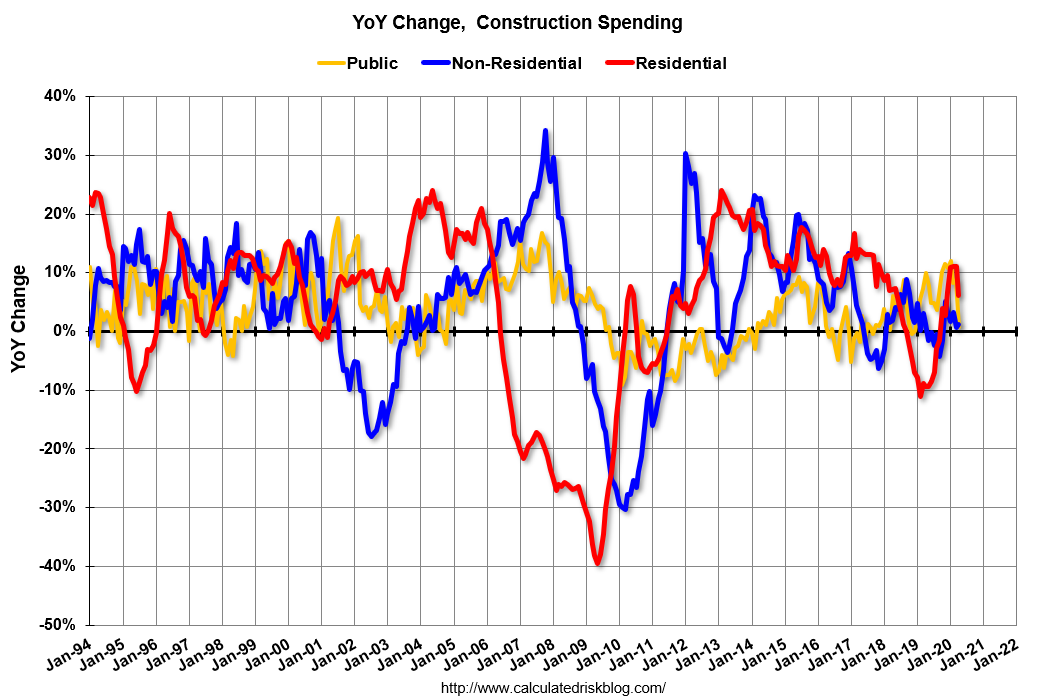 On a year-over-year basis, private residential construction spending is up 6.2%. Non-residential spending is up 1.1% year-over-year. Public spending is up 0.8% year-over-year.