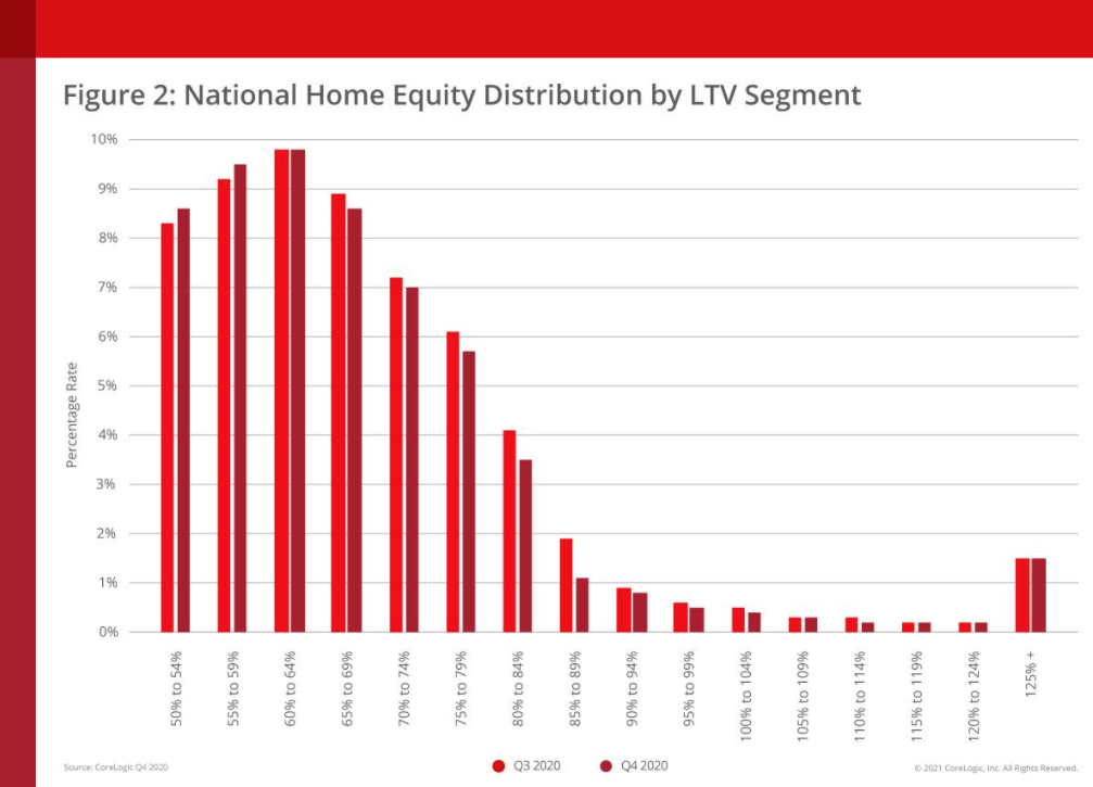 This graph from CoreLogic compares Q4 to Q3 2020 equity distribution by LTV. There are still quite a few properties with LTV over 125%. But most homeowners have a significant amount of equity. This is a very different picture than at the start of the housing bust when many homeowners had little equity.