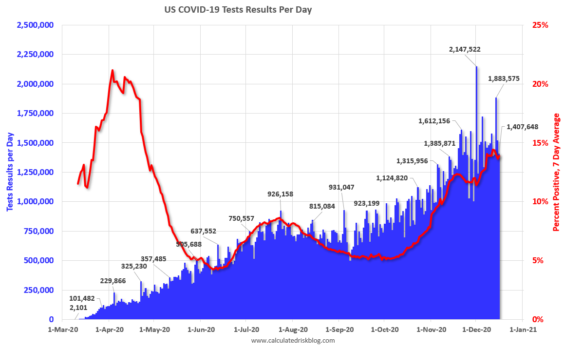 The US is now averaging well over 1 million tests per day. Based on the experience of other countries, for adequate test-and-trace (and isolation) to reduce infections, the percent positive needs to be under 5% (probably close to 1%), so the US has far too many daily cases – and percent positive – to do effective test-and-trace.
