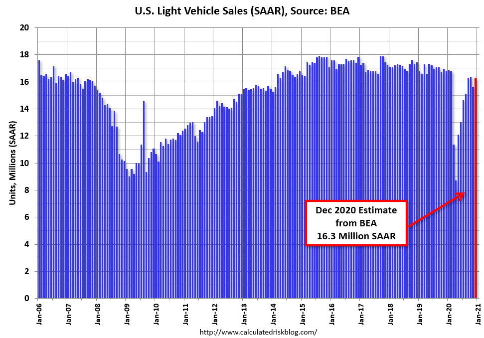 The BEA released their estimate of light vehicle sales for December this morning. The BEA estimates sales of 16.27 million SAAR in December 2020 (Seasonally Adjusted Annual Rate), up 4.1% from the November sales rate, and down 3.2% from December 2019.