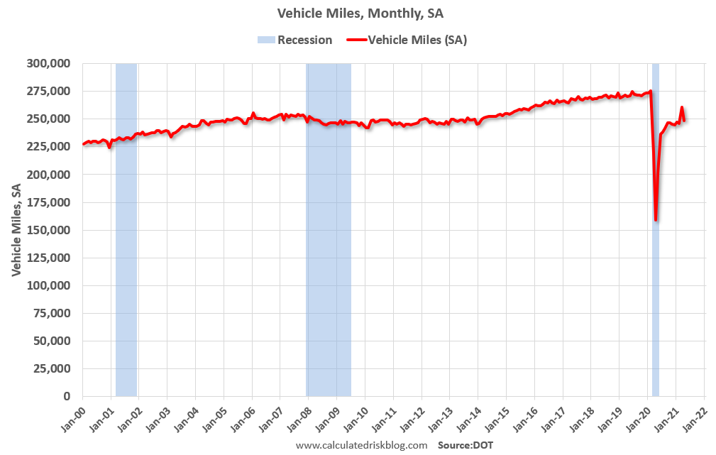 This graph shows the monthly total vehicle miles driven, seasonally adjusted.