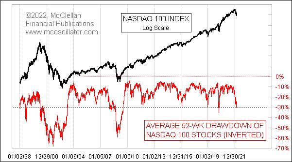 During the period of the Fed doing Quantitative Easing (QE), since 2009, an average drawdown of anything close to 30% had marked a great buying opportunity. This current one may be another in that series of juicy oversold bottoming opportunities. But, looking back farther, we saw much bigger average drawdown readings for NDX stocks during the 2008 bear market, and even more so in the aftermath of the 2000 Internet Bubble top.