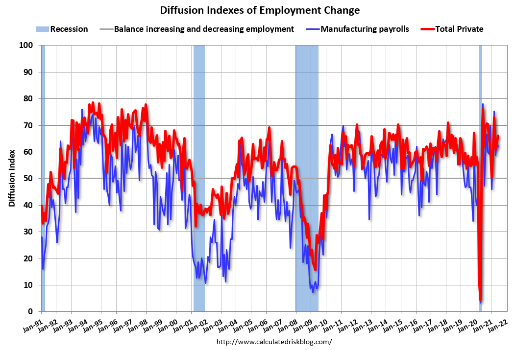 The BLS diffusion index for total private employment was at 66.1 in June, up from 63.0 in May.