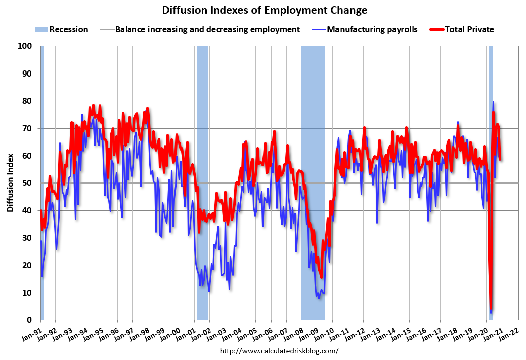 The BLS diffusion index for total private employment was at 58.7 in November, down from 70.7 in October.
