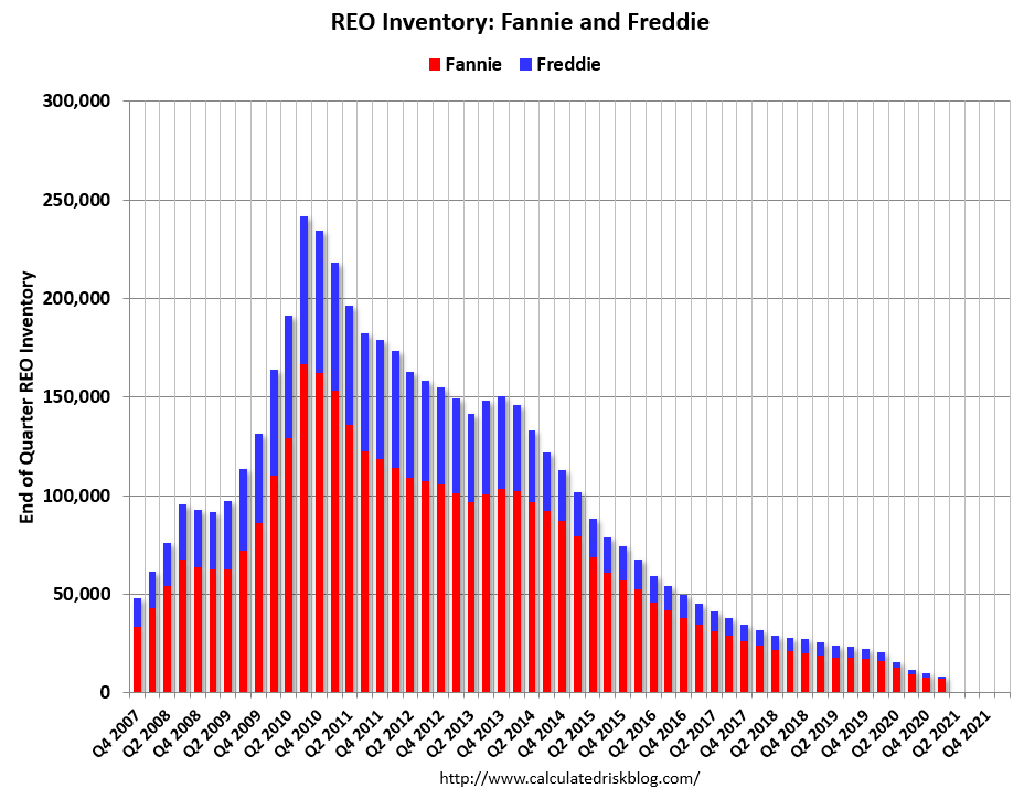 Fannie Mae reported the number of REO declined to 6,918 at the end of Q1 2021 compared to 16,289 at the end of Q1 2020.