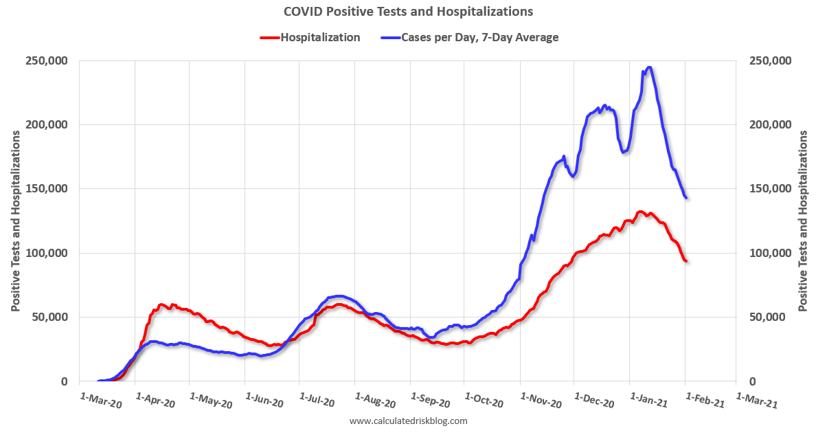 It seems likely cases and hospitalizations have peaked, but are declining from a very high level.