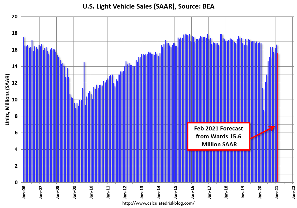 The Wards forecast of 15.6 million SAAR, would be down about 6% from January.