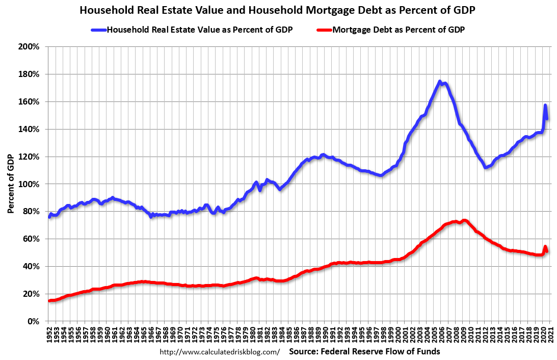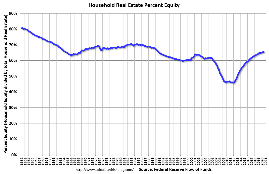 In Q3 2020, household percent equity (of household real estate) was at 65.5% – unchanged from Q2.