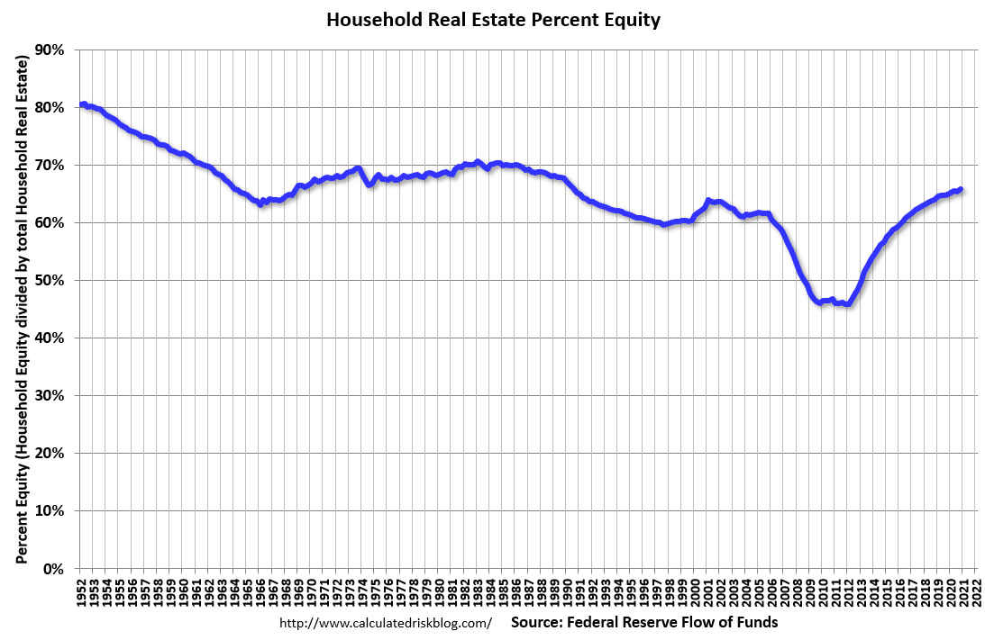 In Q4 2020, household percent equity (of household real estate) was at 65.9% – up from 65.5% in Q3.