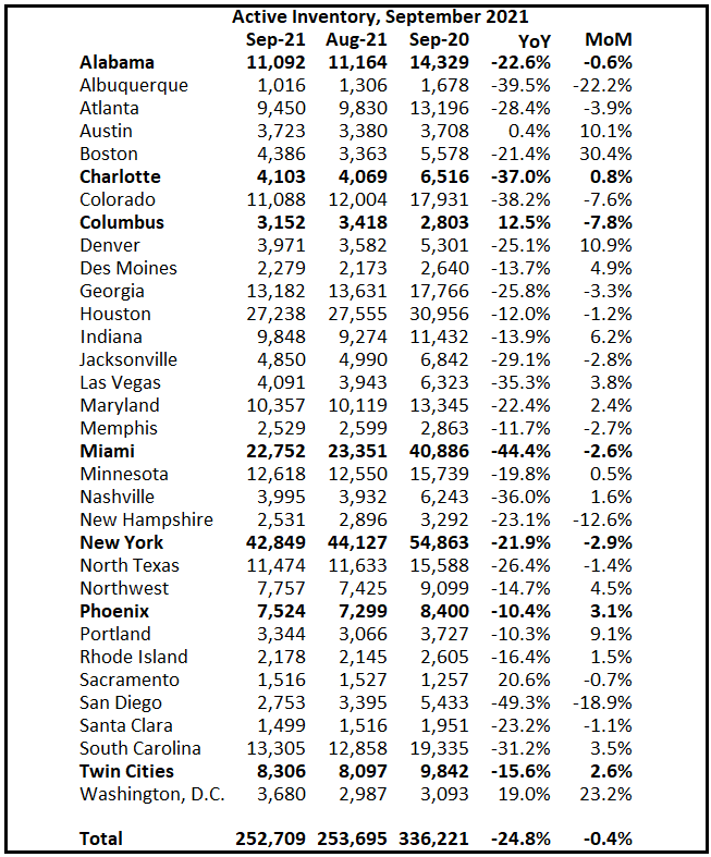 Active Inventory Sept 20211. Inventory is still very low, and inventory in most areas is at a record low for the month of September.