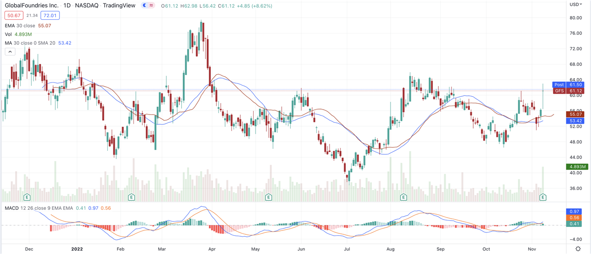 The semiconductor manufacturing industry has been powering down throughout 2022, but newly-public GlobalFoundries (NASDAQ:GFS) is bucking that trend with a gain of 10.90% in the past month and 5.99% in the past three months.