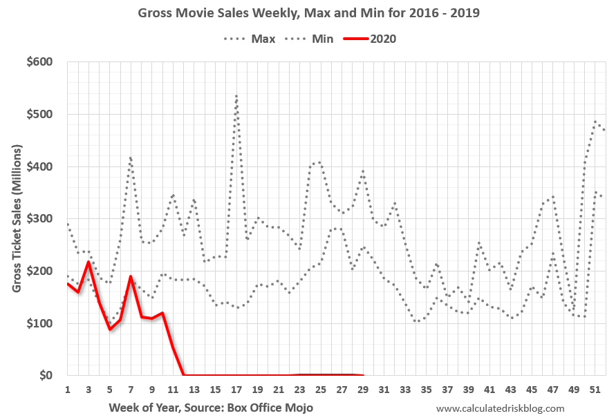 Movie ticket sales have picked up a slightly from the bottom, but are still under $1 million per week (compared to usually around $300 million per week), and ticket sales have essentially been at zero for eighteen weeks.