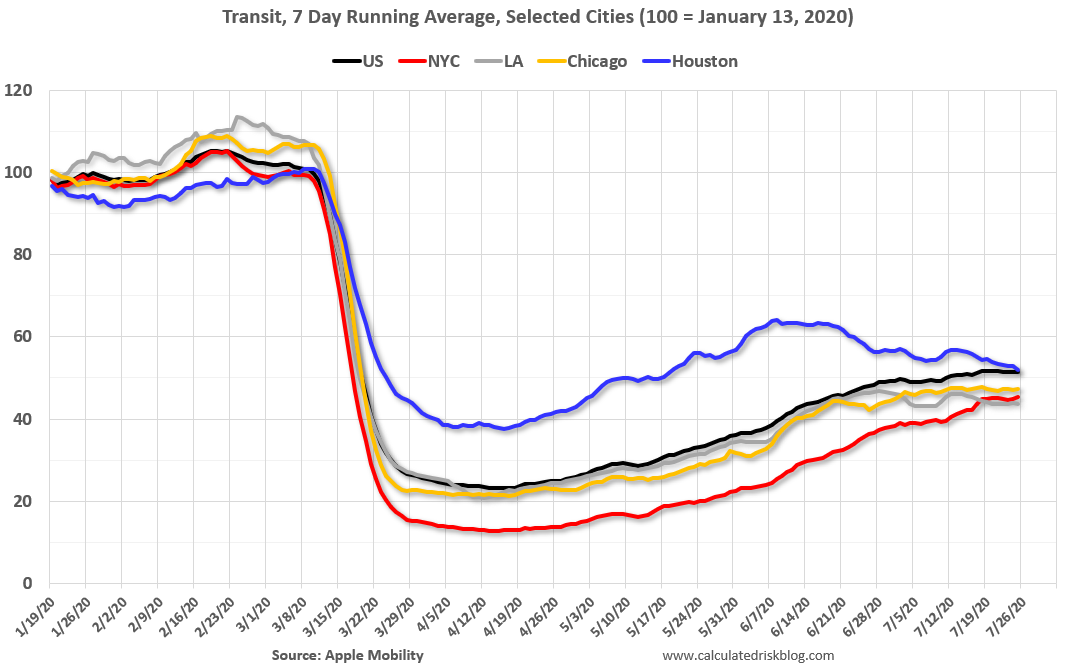 According to the Apple data directions requests, public transit in the 7 day average for the US is still only about 51% of the January level. It is at 45% in New York, and 52% in Houston (down over the last few of weeks).