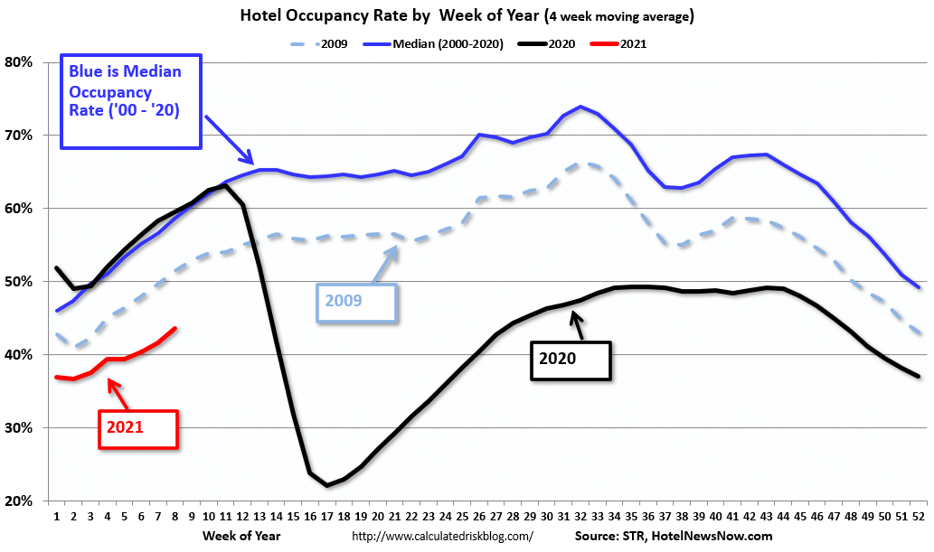 In a few weeks, the year-over-year comparisons will be easy – since occupancy declined sharply at the onset of the pandemic – but occupancy will still be down significantly from normal levels.