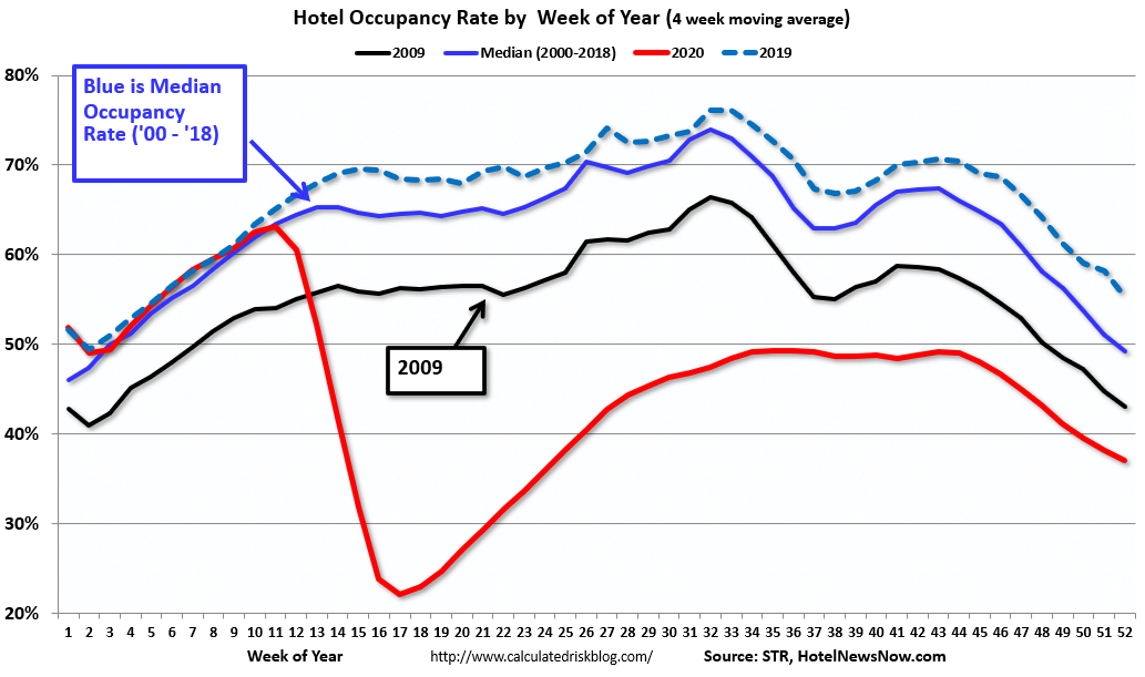 The red line is for 2020, dash light blue is 2019, blue is the median, and black is for 2009 (the worst year since the Great Depression for hotels – before 2020).