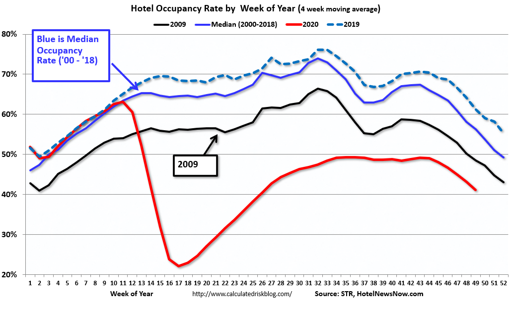 The red line is for 2020, dash light blue is 2019, blue is the median, and black is for 2009 (the worst year since the Great Depression for hotels – before 2020).