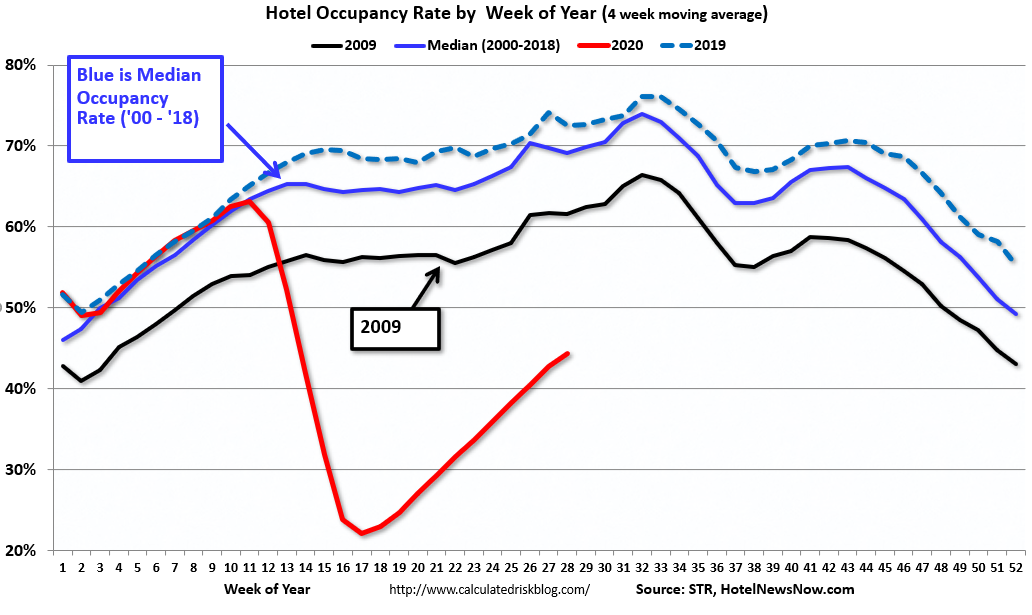 Usually hotel occupancy starts to pick up seasonally in early June. So some of the recent pickup might be seasonal (summer travel). Note that summer occupancy usually peaks at the end of July or in early August.