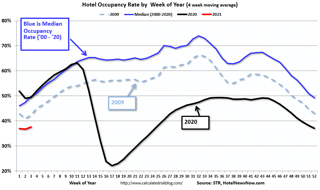 The red line is for 2021, black is 2020, blue is the median, and dashed light blue is for 2009 (the worst year since the Great Depression for hotels prior to 2020).