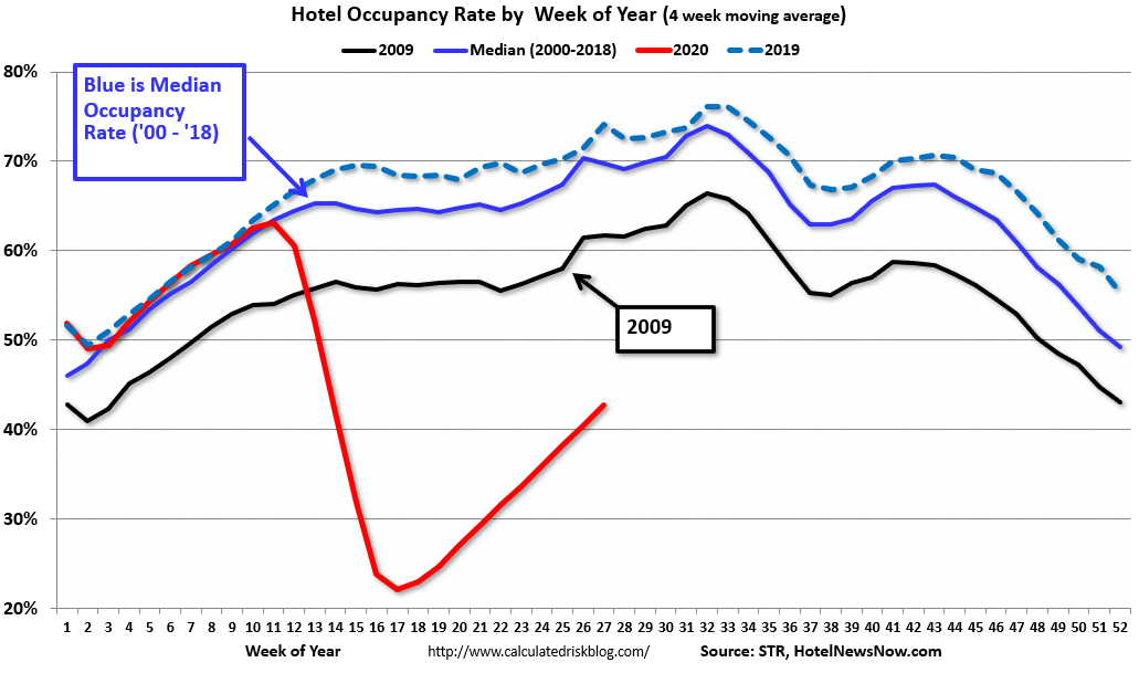 Usually hotel occupancy starts to pick up seasonally in early June. So some of the recent pickup might be seasonal (summer travel).   Note that summer occupancy usually peaks at the end of July or in early August.
