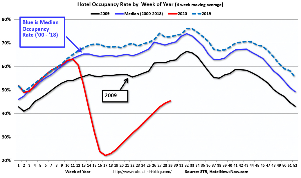 Usually hotel occupancy starts to pick up seasonally in early June. So some of the recent pickup might be seasonal (summer travel). Note that summer occupancy usually peaks at the end of July or in early August.