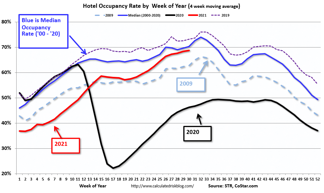 The red line is for 2021, black is 2020, blue is the median, dashed purple is 2019, and dashed light blue is for 2009 (the worst year on record for hotels prior to 2020).