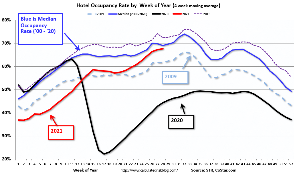 The red line is for 2021, black is 2020, blue is the median, dashed purple is 2019, and dashed light blue is for 2009 (the worst year on record for hotels prior to 2020).