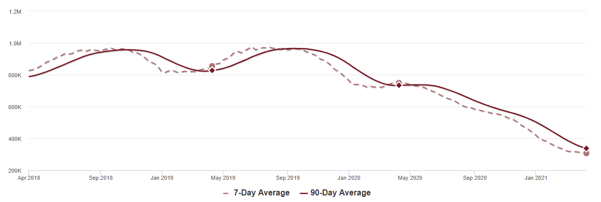As of April 9th, inventory was at 307 thousand (7 day average), compared to 749 thousand the same week a year ago. That is a decline of 59%.