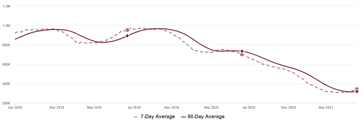 As of June 11th, inventory was at 342 thousand (7 day average), compared to 698 thousand the same week a year ago. That is a decline of 51.0%.
