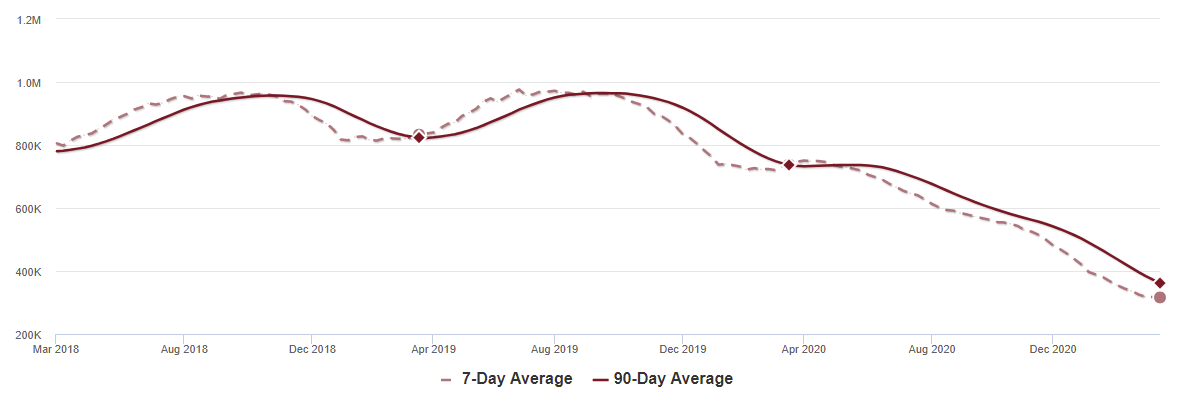 As of March 19th, inventory was at 316 thousand (7 day average), compared to 738 thousand the same week a year ago. That is a decline of 57%.