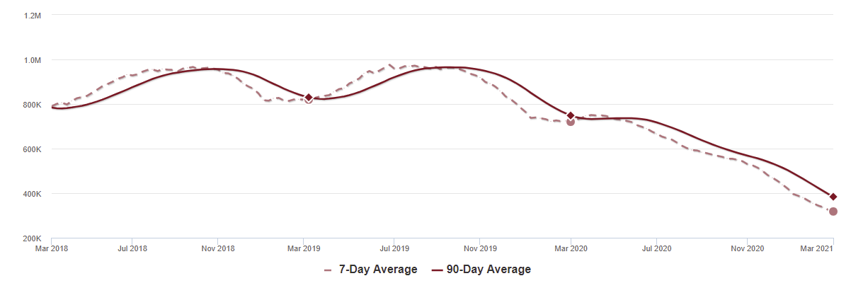 As of March 5th, inventory was at 318 thousand (7 day average), compared to 720 thousand the same week a year ago. That is a decline of 56%.