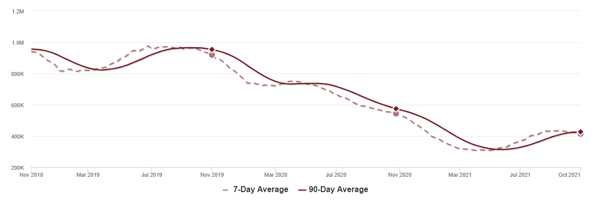 Compared to the same week in 2019, inventory is down 55.0% from 919 thousand. A week ago, inventory was at 423 thousand, and was down 23.1% YoY.