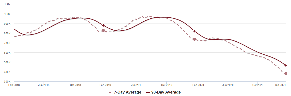 As of January 22nd, inventory is at 380 thousand (7 day average), compared to 736 thousand the same week a year ago. That is a decline of 48%.