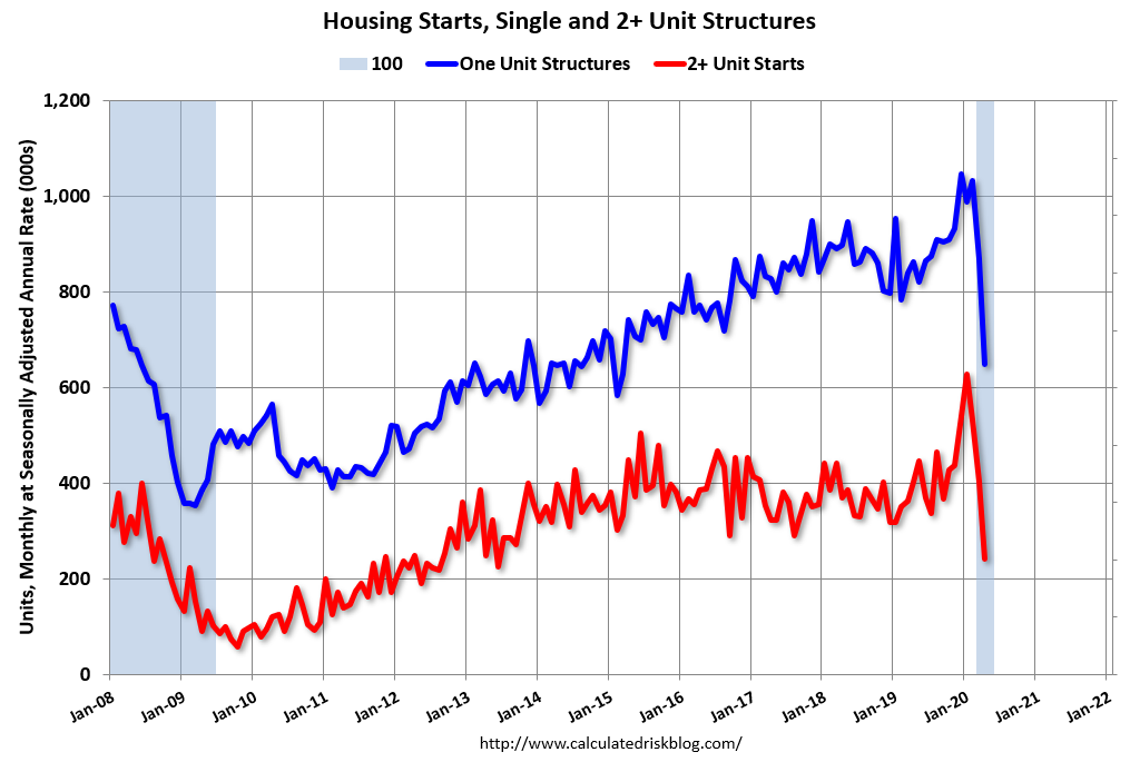 Multi-family starts (red, 2+ units) were down in April compared to March.   Multi-family starts were down 40.2% year-over-year in April.