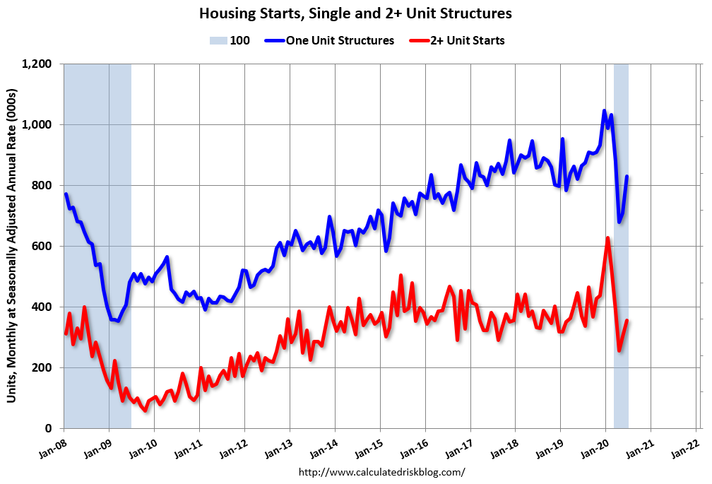 Multi-family starts (red, 2+ units) were up in June compared to May. Multi-family starts were down 4.1% year-over-year in June.