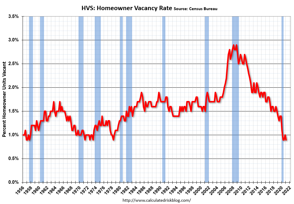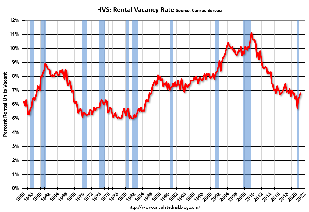 “National vacancy rates in the first quarter 2021 were 6.8 percent for rental housing and 0.9 percent for homeowner housing. The rental vacancy rate of 6.8 percent was not statistically different from the rate in the first quarter 2020 (6.6 percent) and 0.3 percentage points higher than the rate in the fourth quarter 2020 (6.5 percent). The homeowner vacancy rate of 0.9 percent was 0.2 percentage points lower than the rate in the first quarter 2020 (1.1 percent) and 0.1 percentage points lower than the rate in the fourth quarter 2020 (1.0 percent)