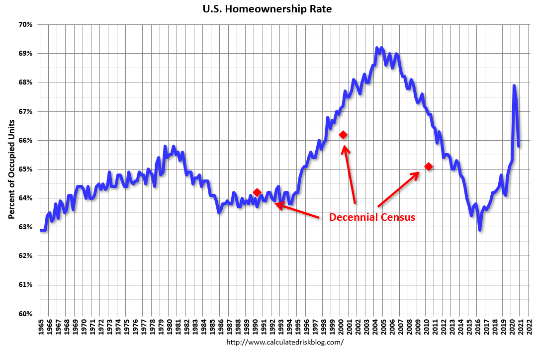 The homeownership rate of 65.8 percent was 0.7 percentage points higher than the rate in the fourth quarter 2019 (65.1 percent) and 1.6 percentage points lower than the rate in the third quarter 2020 (67.4 percent).”