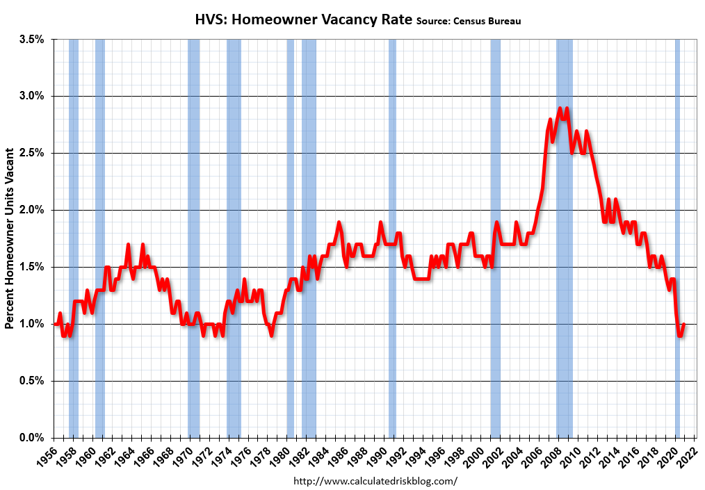 “National vacancy rates in the fourth quarter 2020 were 6.5 percent for rental housing and 1.0 percent for homeowner housing. The rental vacancy rate of 6.5 percent was not statistically different from the rate in the fourth quarter 2019 (6.4 percent) and not statistically different from the rate in the third quarter 2020 (6.4 percent). The homeowner vacancy rate of 1.0 percent was 0.4 percentage points lower than the rate in the fourth quarter 2019 (1.4 percent) and not statistically different from the rate in the third quarter 2020 (0.9 percent).