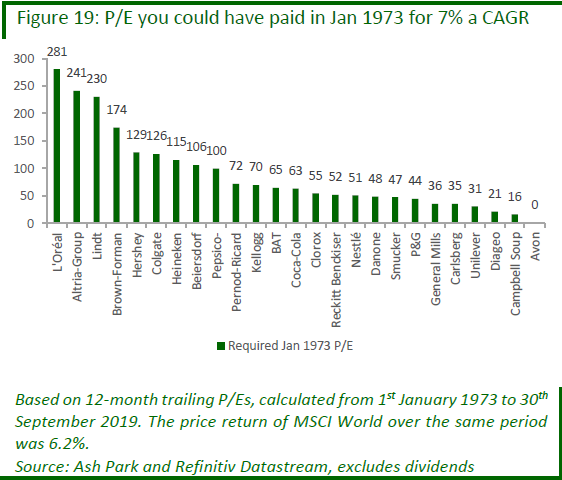 A researcher went back to 1973, and asked themselves what would have been the highest P/E they could have paid for a quality consumer staple that year, and still earn 7% annualized return ( before dividends). They found out that they could have paid 281 times earnings for L’Oreal SA in 1973 or 241 times earnings for Altria, and still generated 7% annualized return (before dividends).