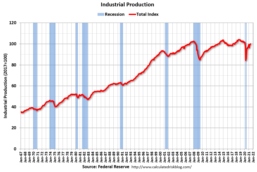 Industrial production increased in June to 100.1. This is 1.2% below the February 2020 level.