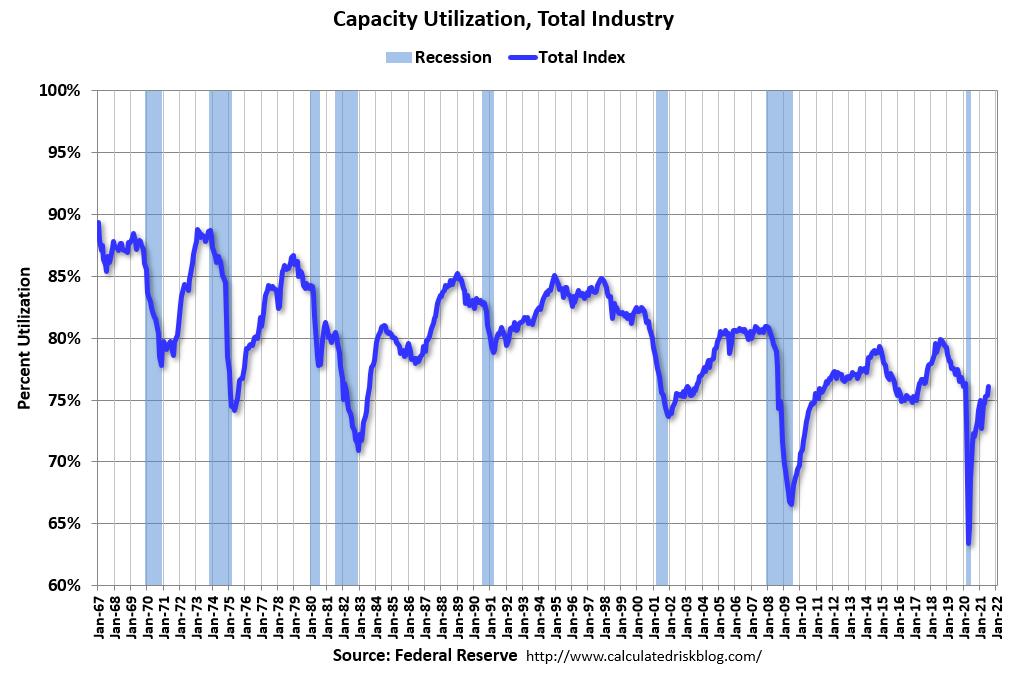 Capacity utilization at 76.1% is 3.5% below the average from 1972 to 2020.