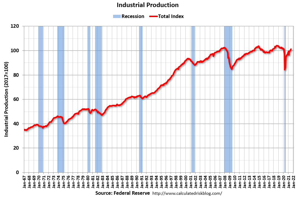 Industrial production increased in July to 101.1. This is 0.2% below the February 2020 level.