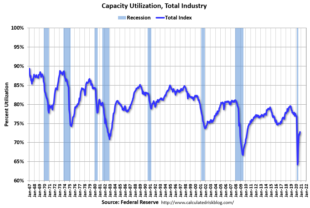 Capacity utilization at 72.8% is 7.0% below the average from 1972 to 2017.