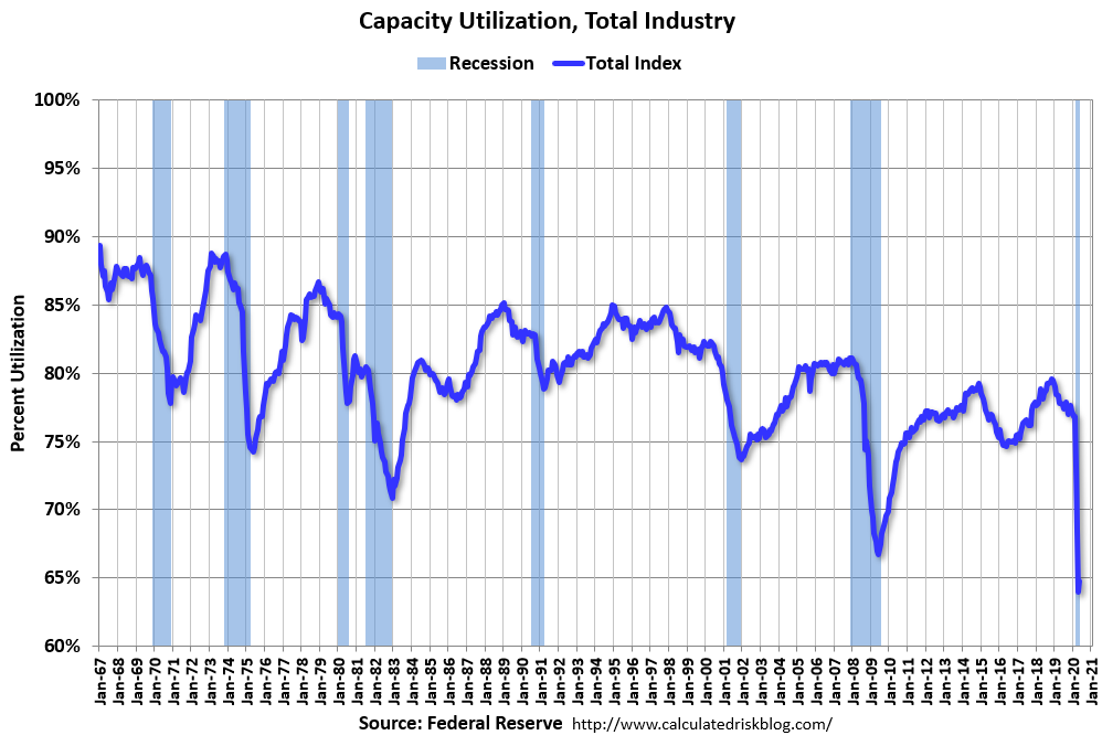 Capacity utilization at 64.8% is 15.0% below the average from 1972 to 2017.