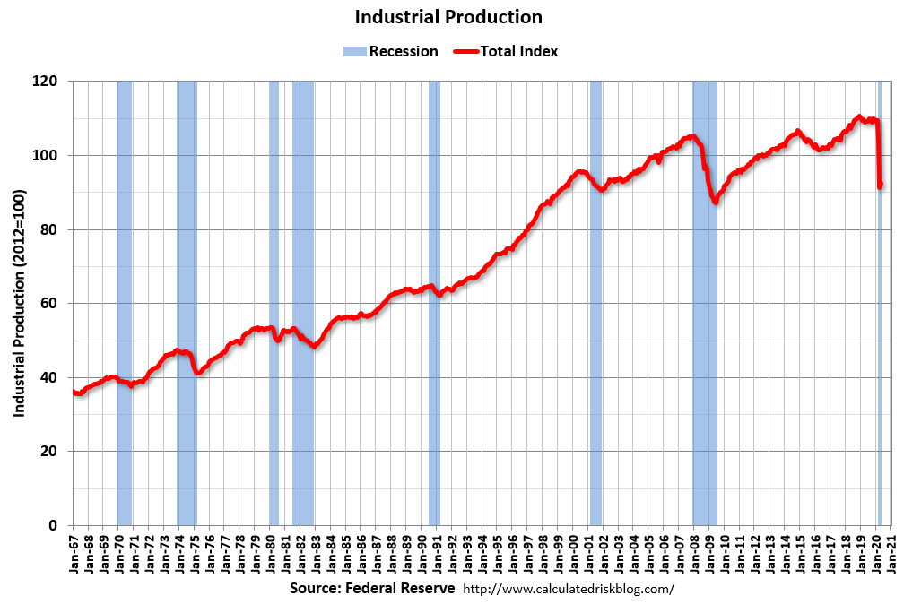 Industrial production increased in May to 92.6. This is 6.3% above the Great Recession low.
