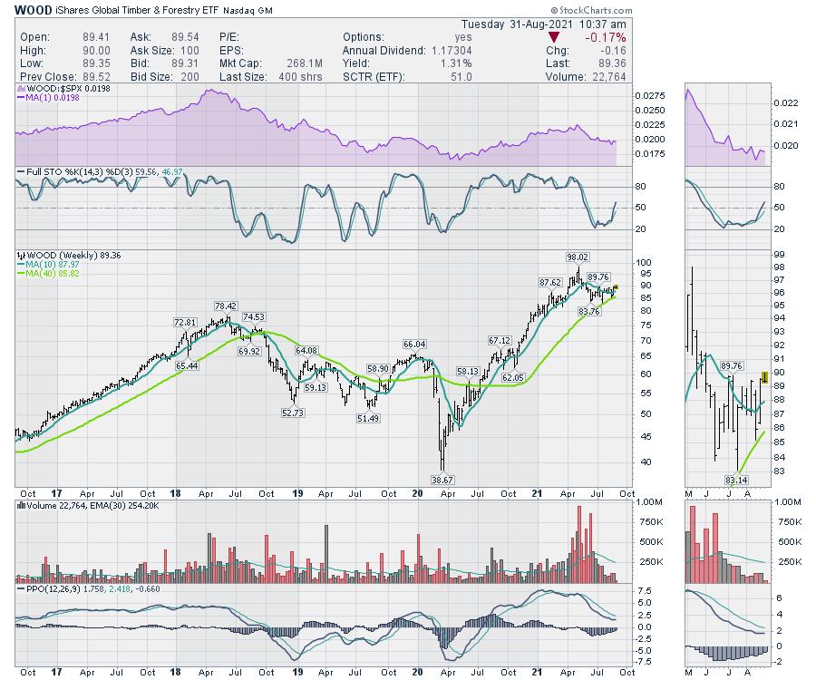 While the lumber chart is interesting here for an entry, typically futures traders trade the commodity. The companies related to the commodity can be traded individually or through the ETF. At this place in time, it is good to be watching WOOD for a breakout, with full recognition of the importance of a stop.
