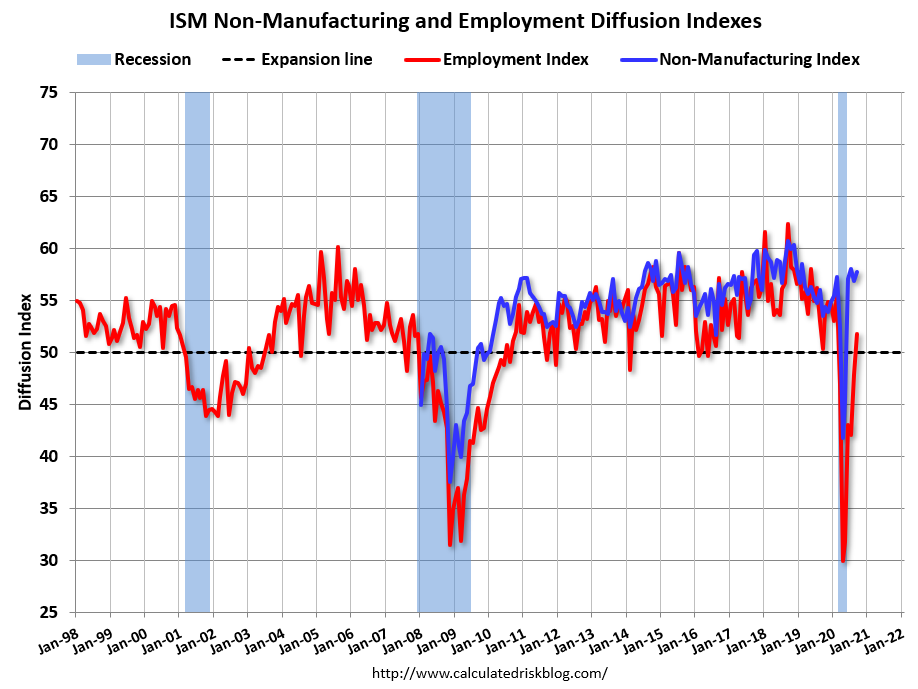 This graph shows the ISM services index (started in January 2008) and the ISM services employment diffusion index.