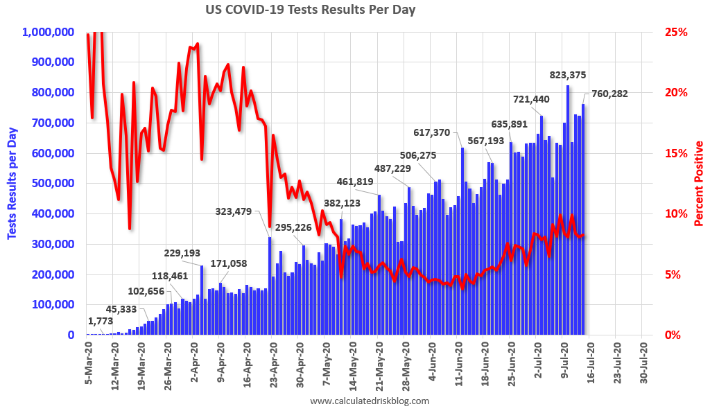 The US is now conducting over 700,000 tests per day, and that might be enough to allow test-and-trace in some areas. Based on the experience of other countries, the percent positive needs to be well under 5% to really push down new infections, so the US still needs to increase the number of tests per day significantly.