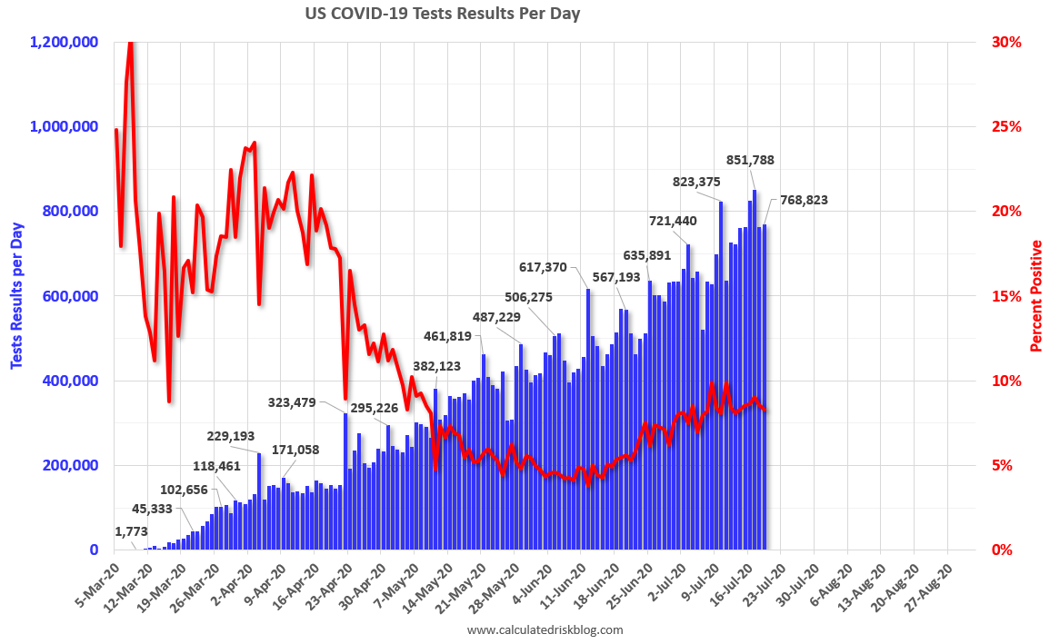 The US is now reporting over 700,000 tests per day. Based on the experience of other countries, the percent positive needs to be well under 5% to really push down new infections, so the US still needs to increase the number of tests per day significantly (or take actions to push down the number of new infections).